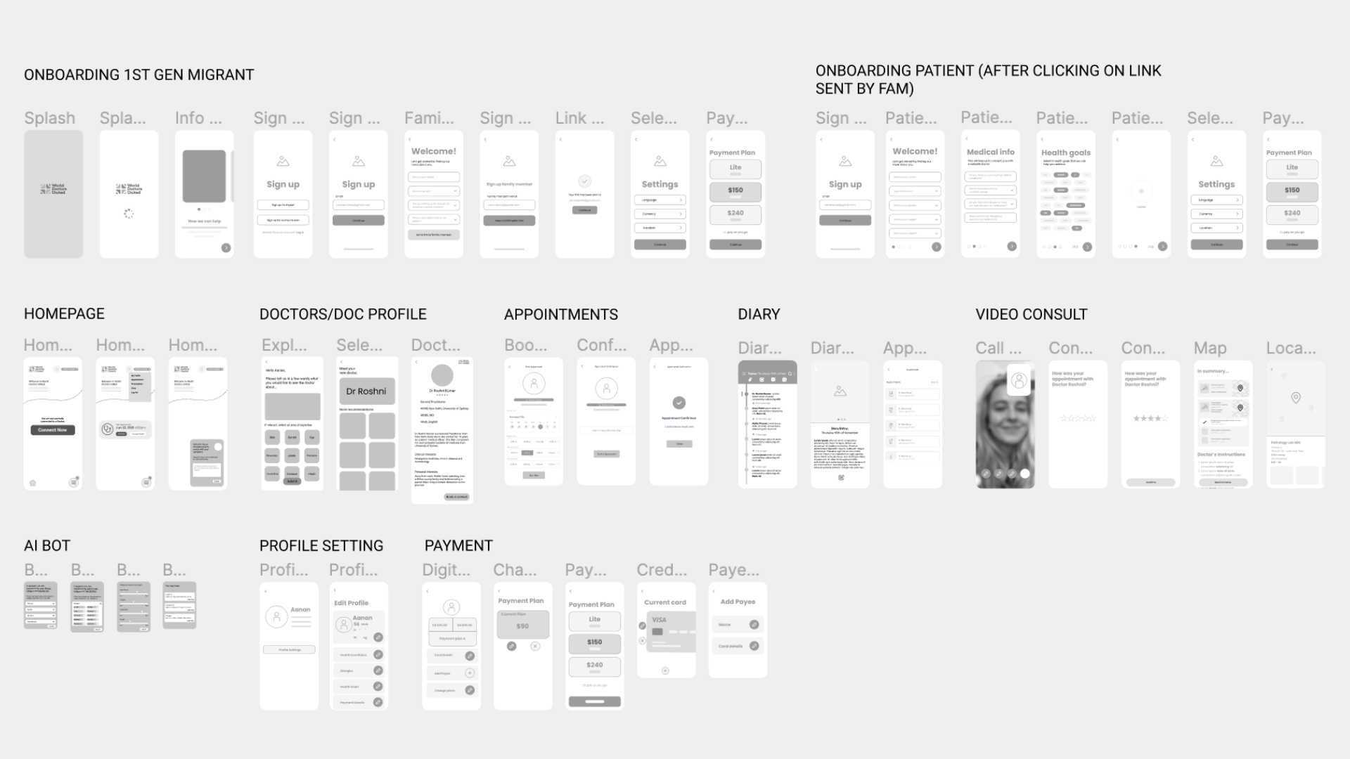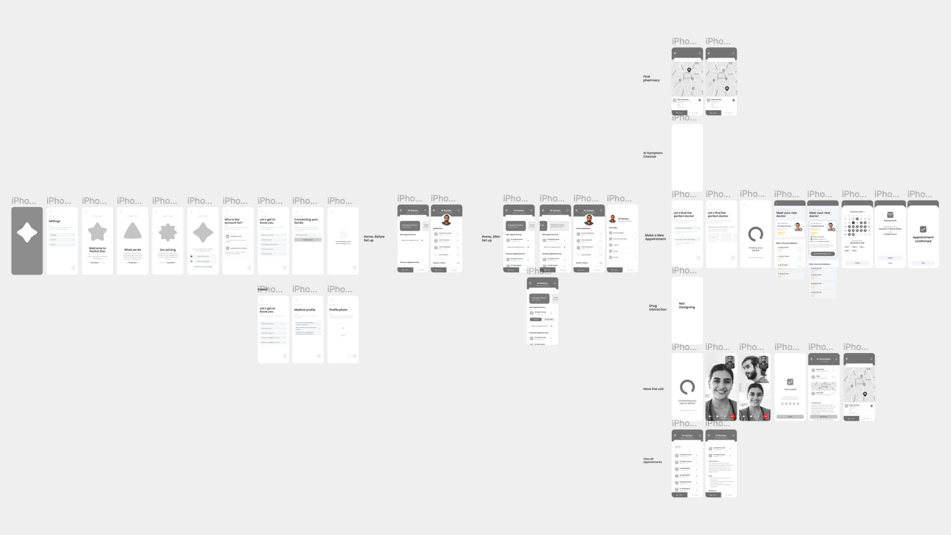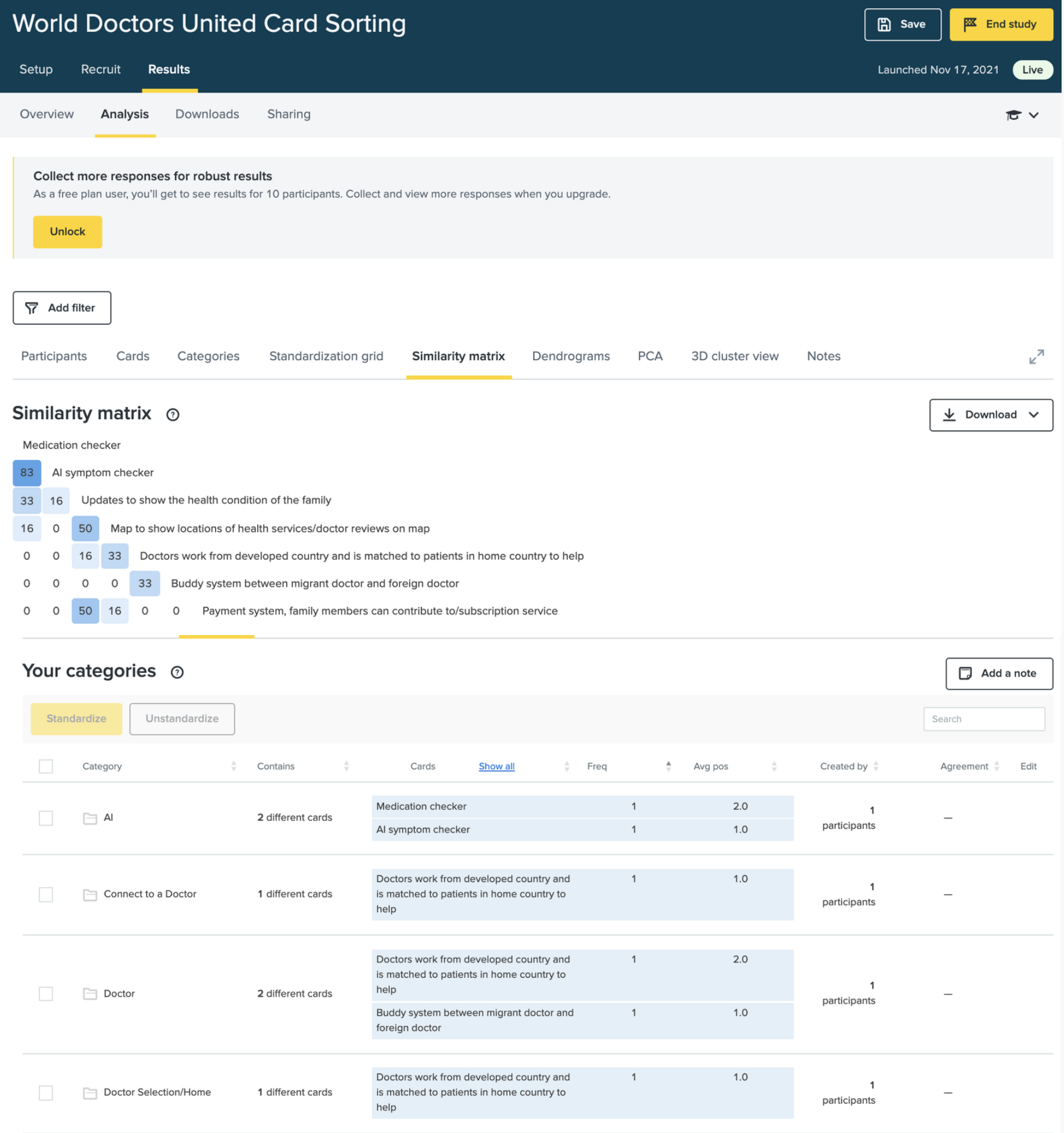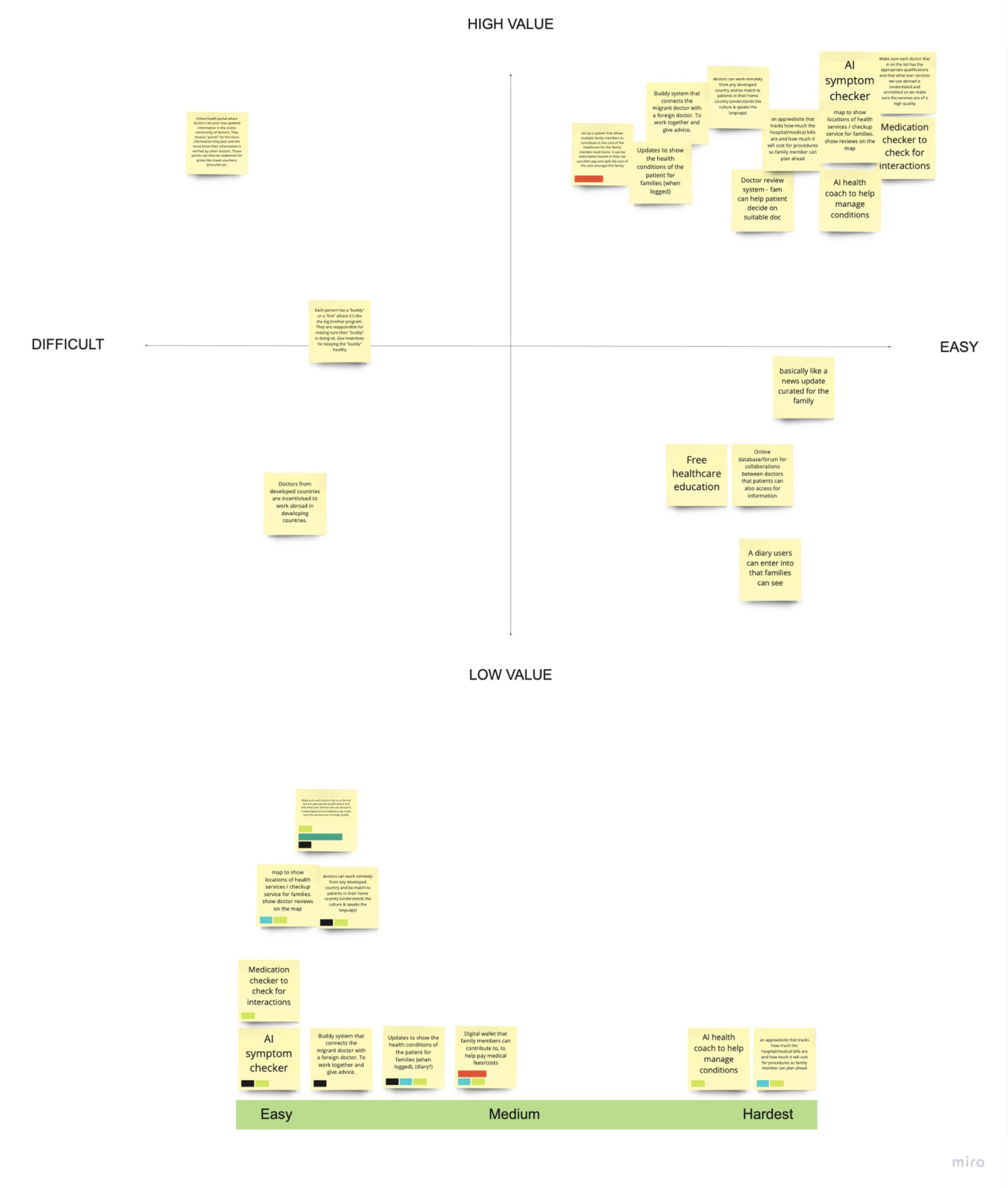 Conducted an open card sort with 6 participants to determine the grouping & categorisation of information within the app. A Similarity matrix was used to identify which types of information would be grouped together. E.G. 83% participants grouped the AI symptom checker together.